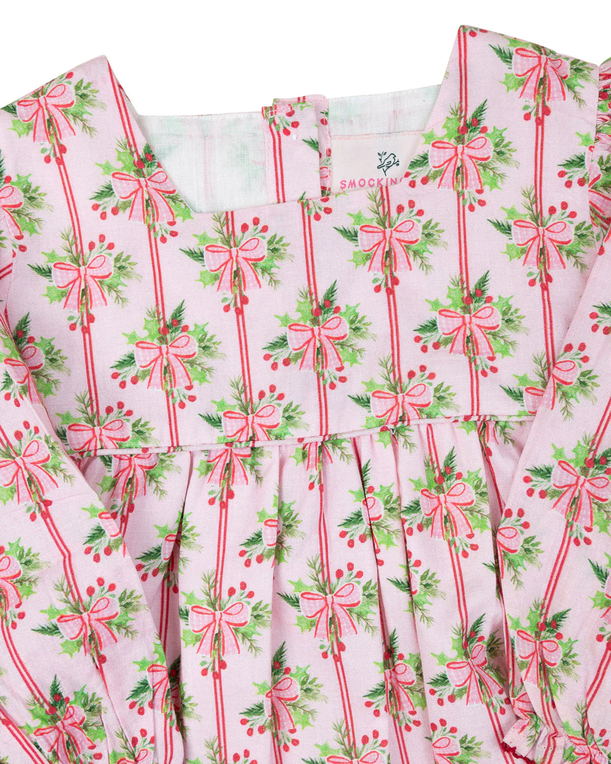 A picture-perfect holiday look! Our Holiday Bow Striped Dress features an elegant Christmas wreath print with bows arranged in a charming linear design. The square neckline and long sleeves add a vintage-inspired touch, while the soft, flowing fabric ensures comfort all season long. Finished with dainty contrast trim, this dress is ideal for holiday gatherings, Christmas photos, and festive celebrations.