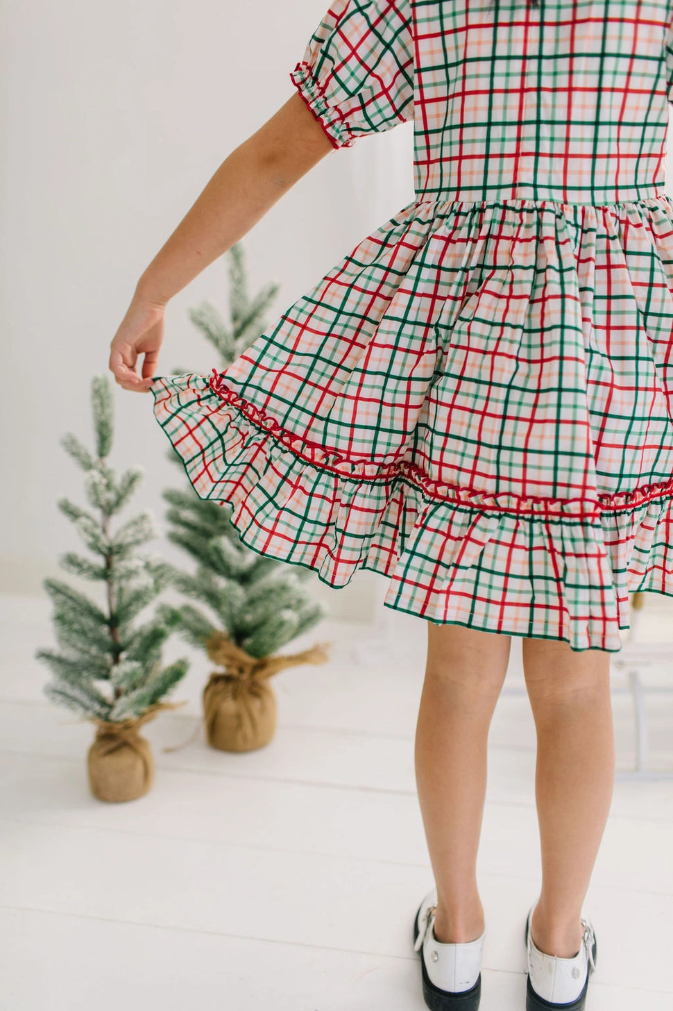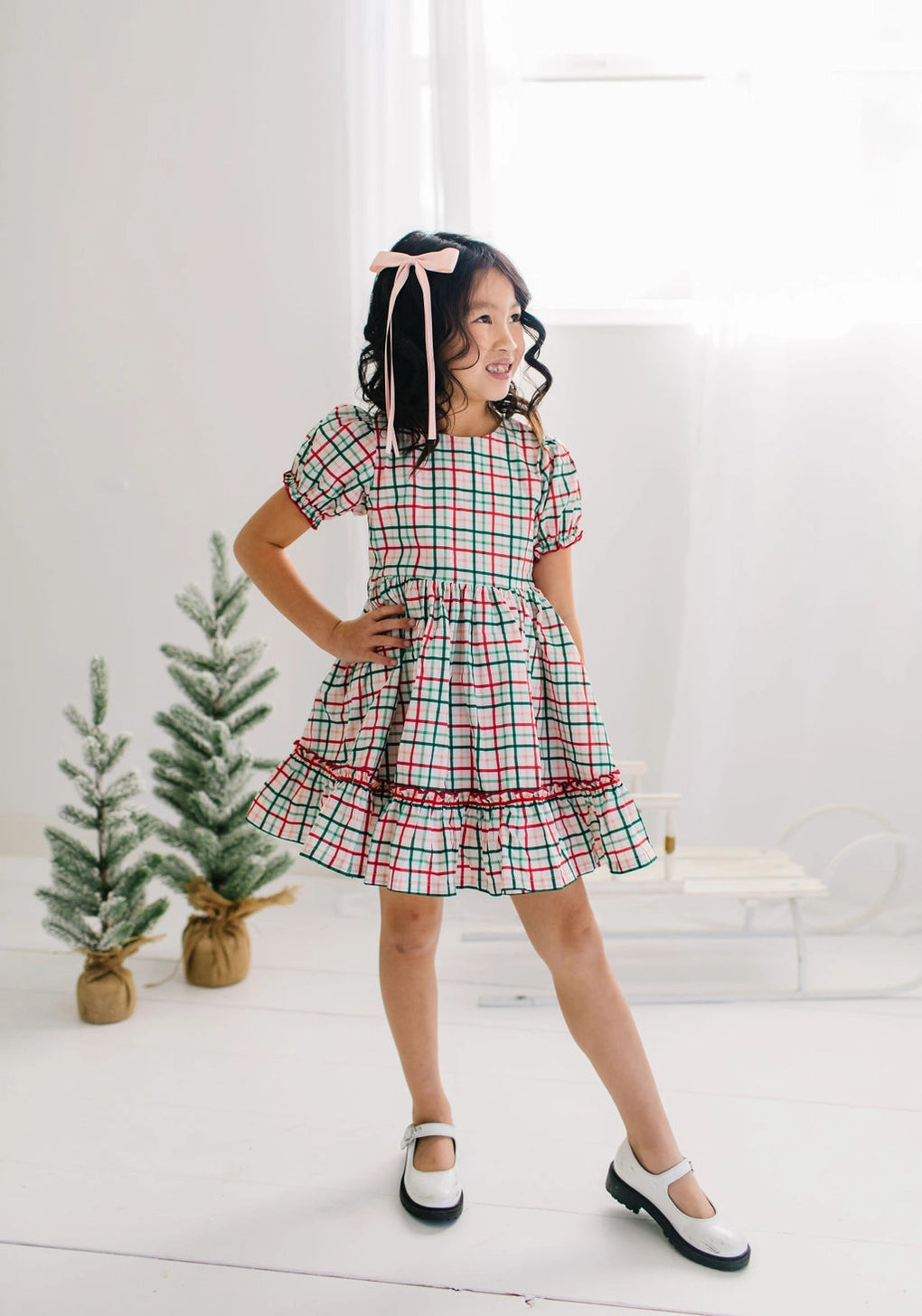 The Aura Dress is all about timeless charm with playful details. Featuring puffed short sleeves with delicate ruffled arm openings, a full skirt with trim and a sweet ruffle hem, this dress brings graceful movement and classic style to your little one’s wardrobe. Crafted from 100% breathable poplin cotton and fully lined for comfort, it’s finished with a zippered back for easy dressing — perfect for special occasions or everyday twirls. 100% poplin cotton with soft cotton lining Puffed sleeves with ruffled arm detail Full skirt with trim and ruffle hem Zippered back closure for easy wear Care Instructions: Machine wash cold with like colors. Lay flat to dry to help preserve fit and fabric quality.