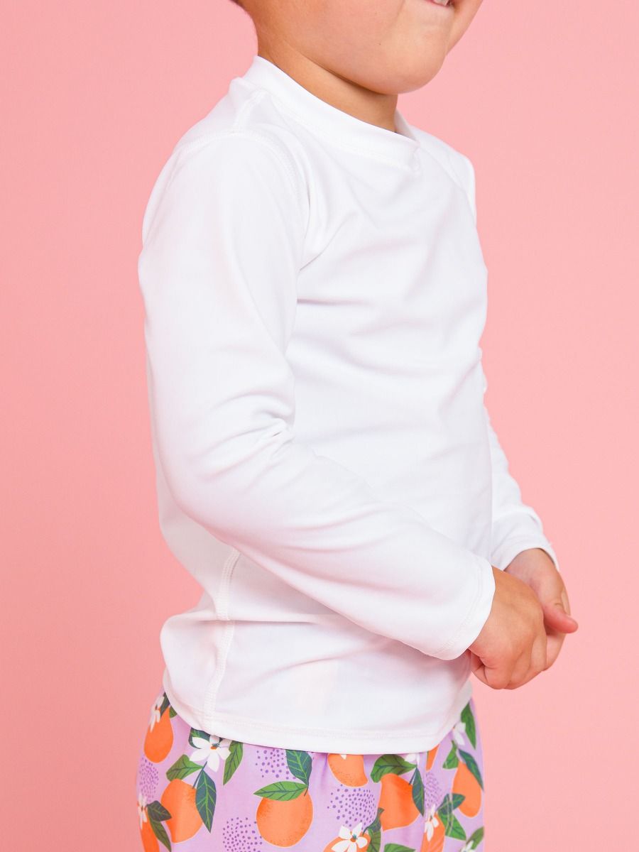 "White Long Sleeve Rash Guard" is the perfect beachwear for your little boy. This stylish and sporty rash guard offers UPF 50+ sun protection, making it ideal for a day at the beach, by the pool, or just playing in the sun. The long sleeves provide extra coverage, while the lightweight and breathable fabric ensures your child stays comfortable and cool.