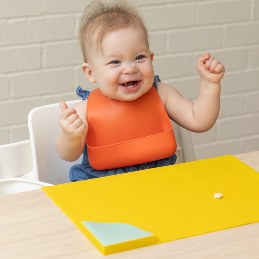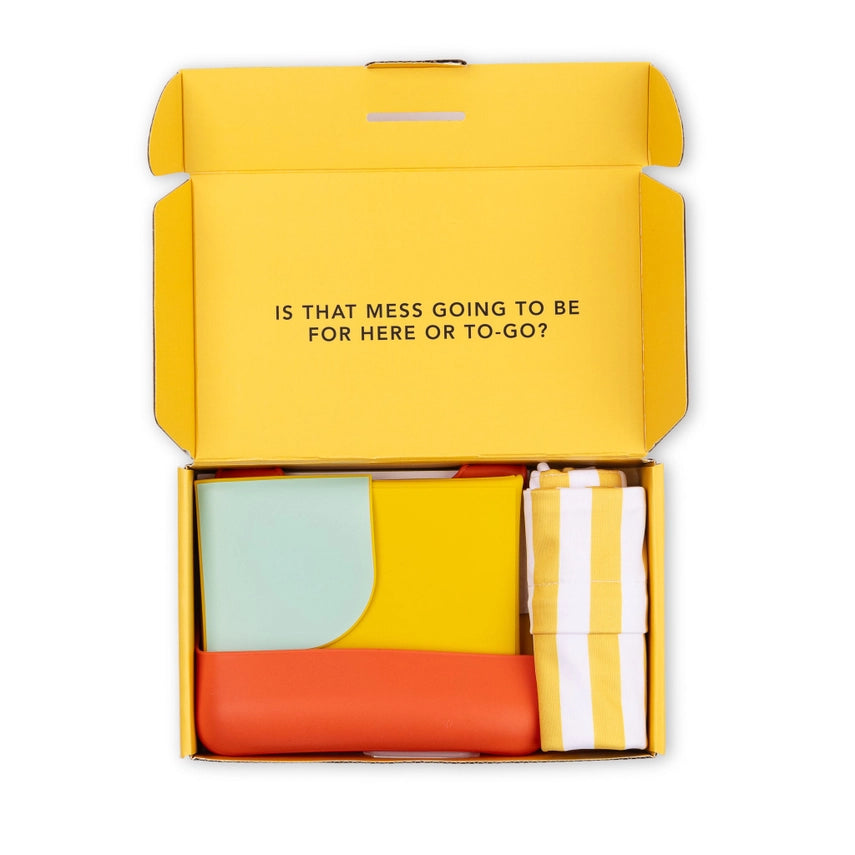 Our expert-approved toolkit of mealtime essentials to take on-the-go! This set is the perfect new baby gift and a parent must-have. Just pack up the bib and placemat in the on-the-go bag, throw in some snacks and meals can happen anywhere. One set includes everything you need: -The silicone Beginner Bib has a narrow body for little arms to easily reach the eating surface and food. -The Wonder Mat is the first-of-its-kind foldable placemat with Table Guard technology, a 2" flap to cover the front of the eating surface and keep the entire eating area both clean and protected. -The waterproof Wet Bag has a front zipper pocket for bib + placemat and a back zipper pocket for food and snacks. -Bib (10" x 7") and Placemat (15" x 12"): Non Toxic Food Grade Silicone. FDA Approved and Free of BPA, PVC, Phthalates. Dishwasher safe. -Wet Bag (8.6" x 10.2"): Polyester. Machine washable.