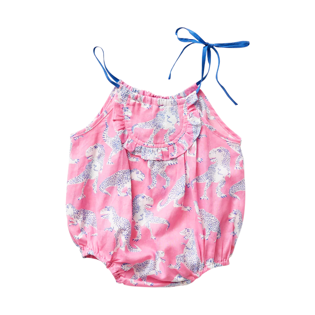 All-over dinosaur prints add a whimsical accent to our Baby Ester Bubble Romper, designed in vibrant pink and adorned with ruffle trim. Crafted in cotton gauze, it keeps baby cool and comfortable effortlessly.
