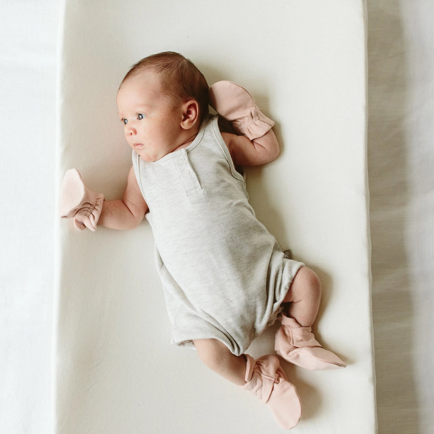 Stays on Signature two-part closure system ensures scratch and germ protection and allows adjustable fit as baby grows Luxuriously soft Our machine-washable, 70% viscose from bamboo/30% organic cotton blend is breathable, naturally antimicrobial and environmentally sustainable
