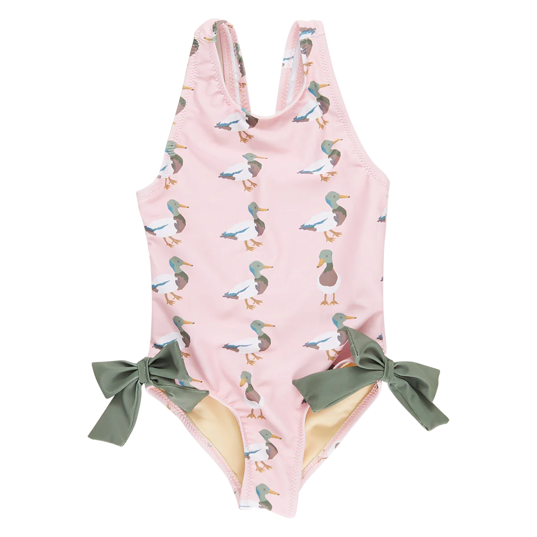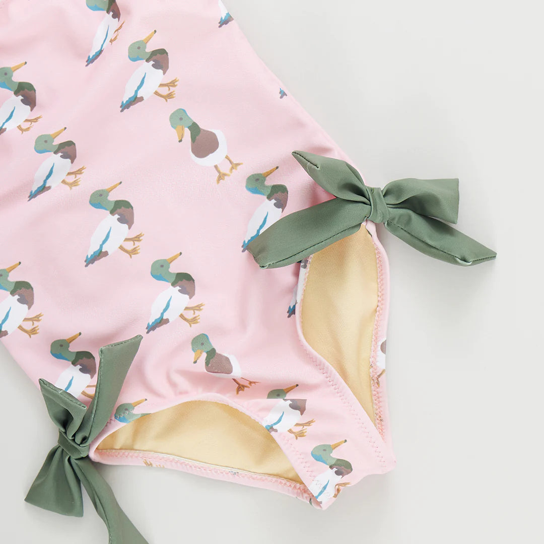 Duck! A friendly flock of adorable ducks waddle across a blush colored ground in our Pink Mallard Friends print shown here on on our new to the swim collection Girls Sutton Suit. Decorative bows at the hips and unique diagonal straps in the back add real style to this traditional tank suit. Coordinate with our Baby Girls Joy Tankini Suit or GirlsJoy Tankini Suit for a cheerful Big Sis / Little Sis look. Made by Pink Chicken.